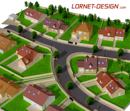 Prévisualisation d'un quartier d'habitation en 3D pour une étude d'urbanisation.